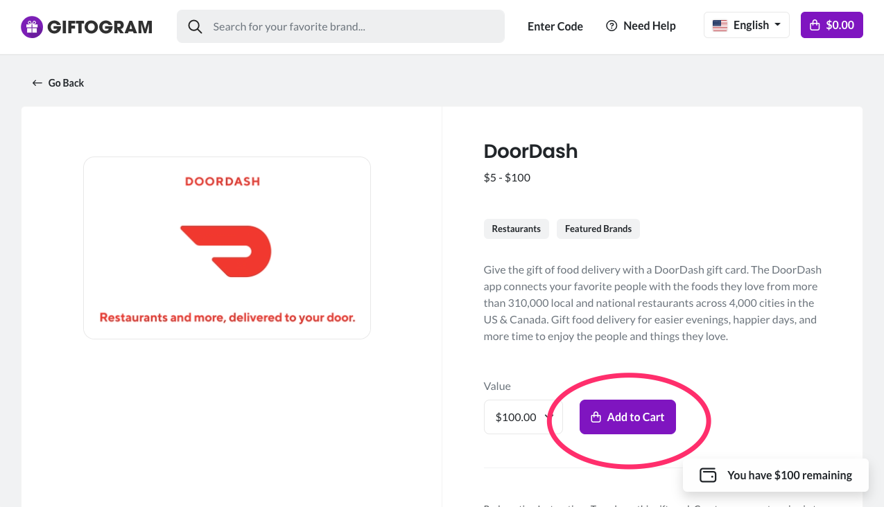 Once, they find a gift card they'd like to redeem, recipients will make their selection and follow the instructions on screen to complete check out: