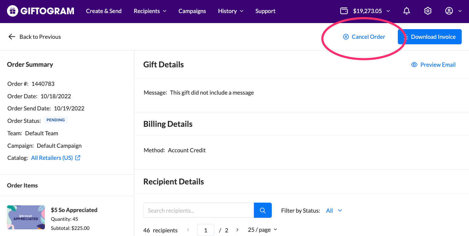 Cancel a pending bulk digital order in your account by navigating to your digital order history