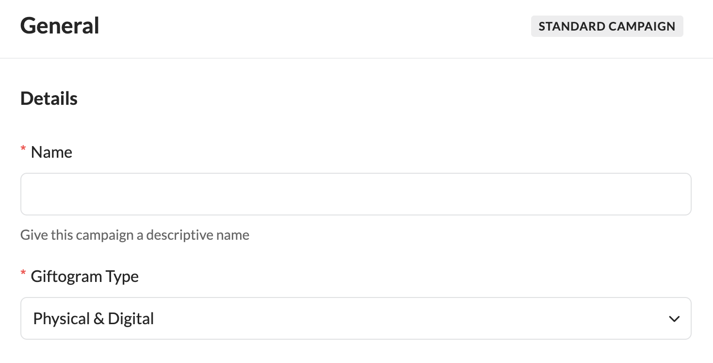 3. Enter the basic details of your campaign, including the name and delivery type (digital gifts or physical cards).