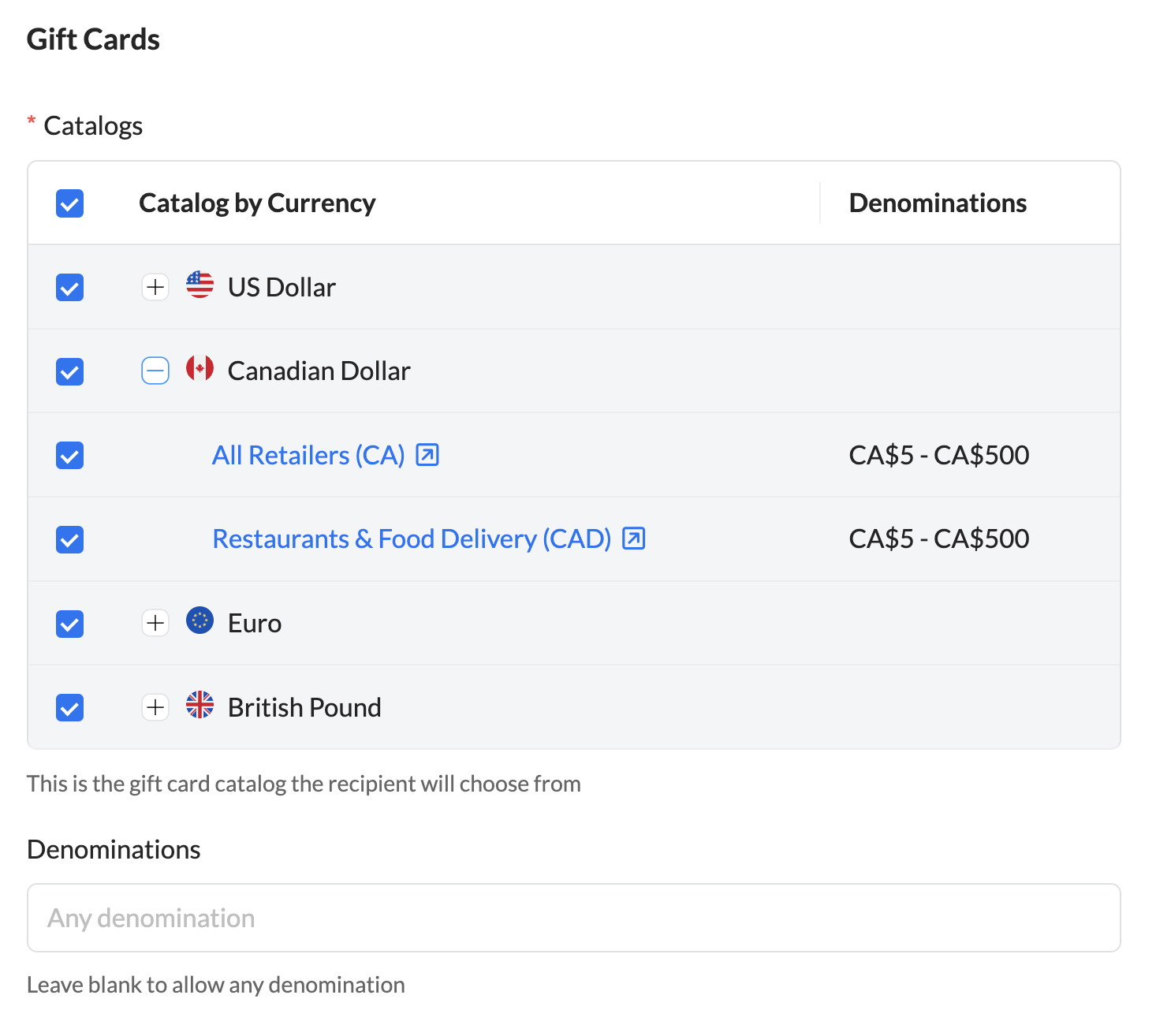 4. Select the gift card currencies, catalogs, and denominations you want to make available in this campaign. Check out this article to add more currencies and catalogs to your account.