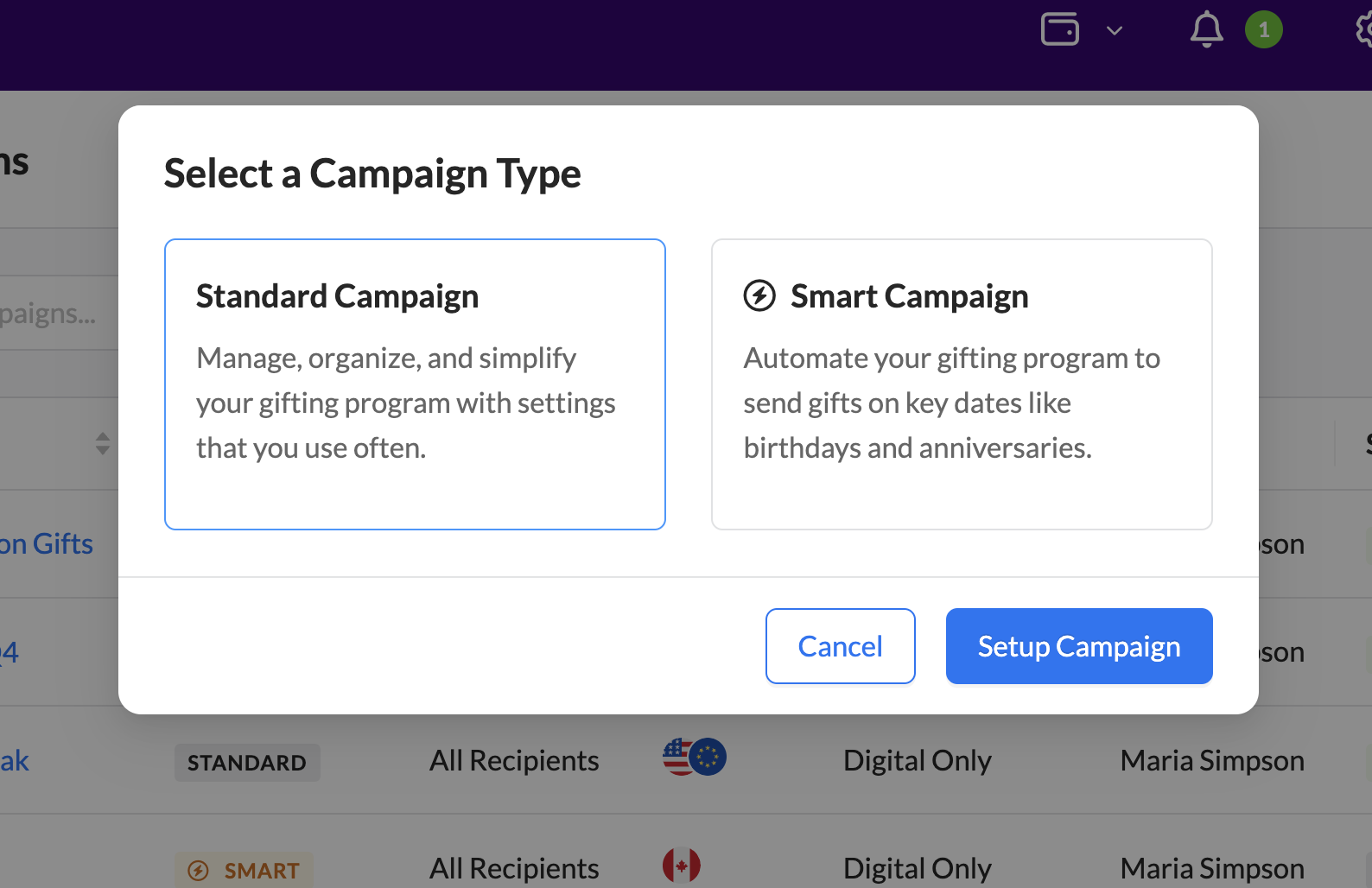 All Giftogram accounts come with a Default Campaign. You can edit your default campaign or create a new campaign when you're ready.