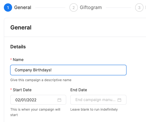 Follow the instructions on the screen to enter the general details of your Smart Campaign, including its name, the key date for the automatic gift to go out, and the frequency of the gifts (annually, every five years, ten years, etc.). To see how to set up a Milestone Gifting Campaign specifically, click here.