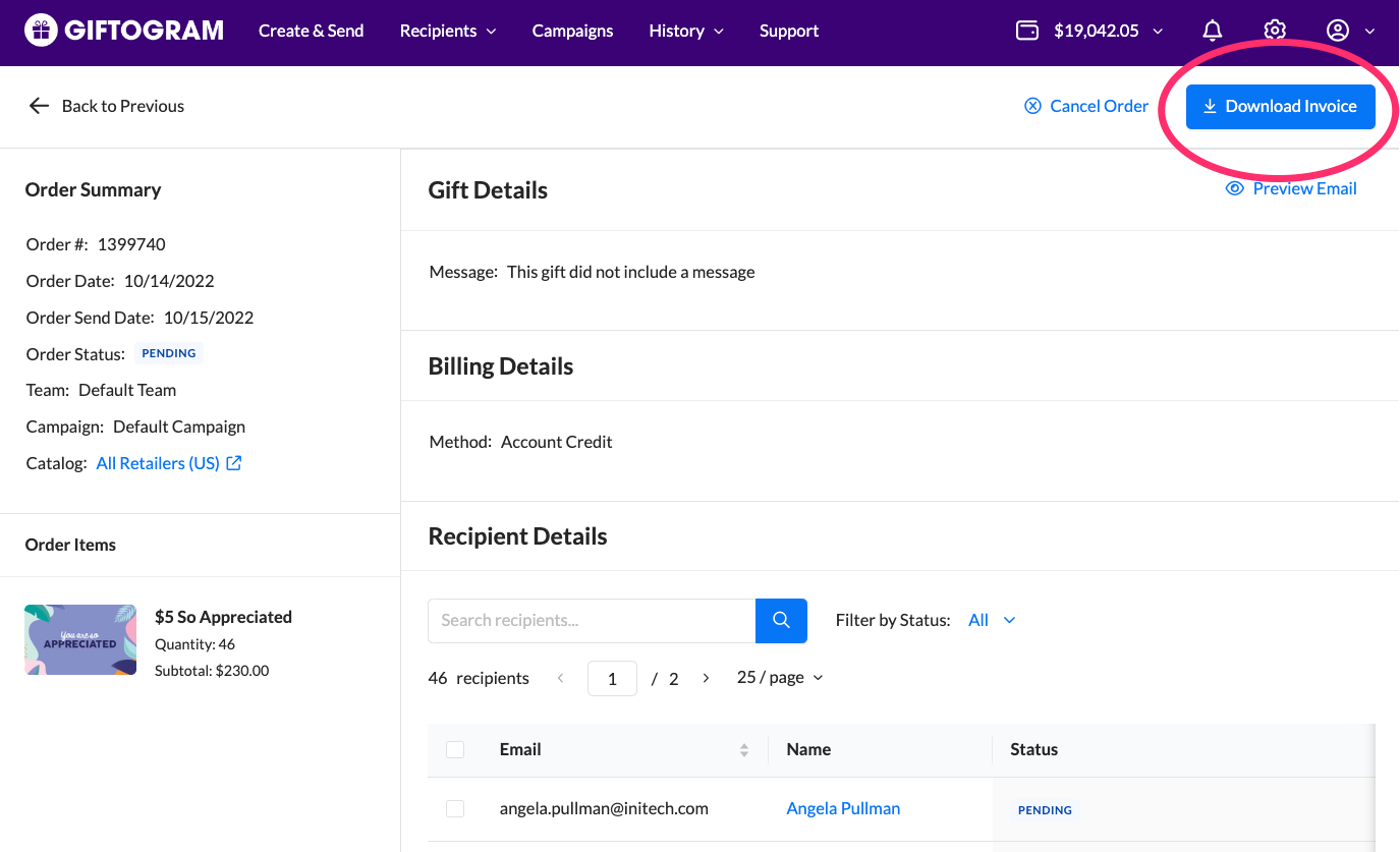 View order details and delivery statuses, and download a single invoice for one send.