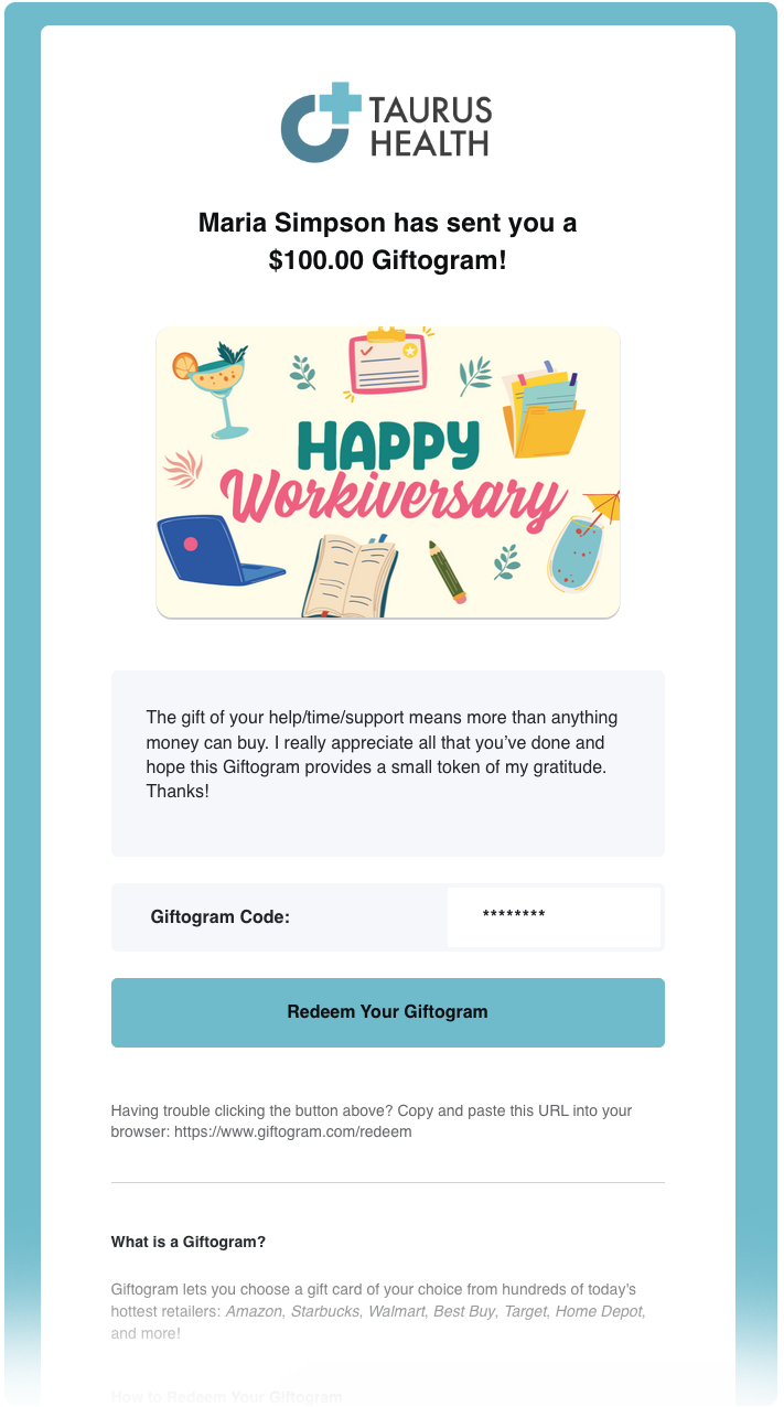 Below is an example of the email recipients will receive when you send them a Giftogram. You can choose the card design, select your brand kit, and include a personalized message.